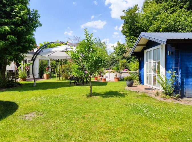 Im Garten sind ein praktischer Geräteschuppen sowie ein zusätzlicher Unterstand errichtet.